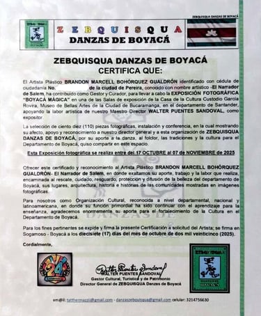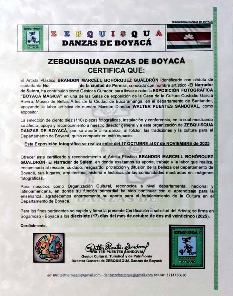 Los invitamos a sumergirse en esta experiencia visual, a redescubrir Boyacá a través de los ojos del maestro Walter Puentes Sandoval y su trayectoria de casi un cuarto de siglo como gestor cultural, a dejarse llevar por la magia y el encanto que emanan de cada imagen. Que esta exposición sea un llamado a valorar nuestras raíces, a apreciar la diversidad cultural y a reconocer la belleza que nos rodea, recordándonos siempre que, en el corazón de Boyacá, la magia está presente en cada rincón.